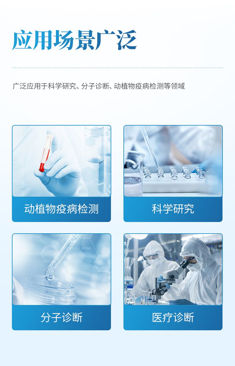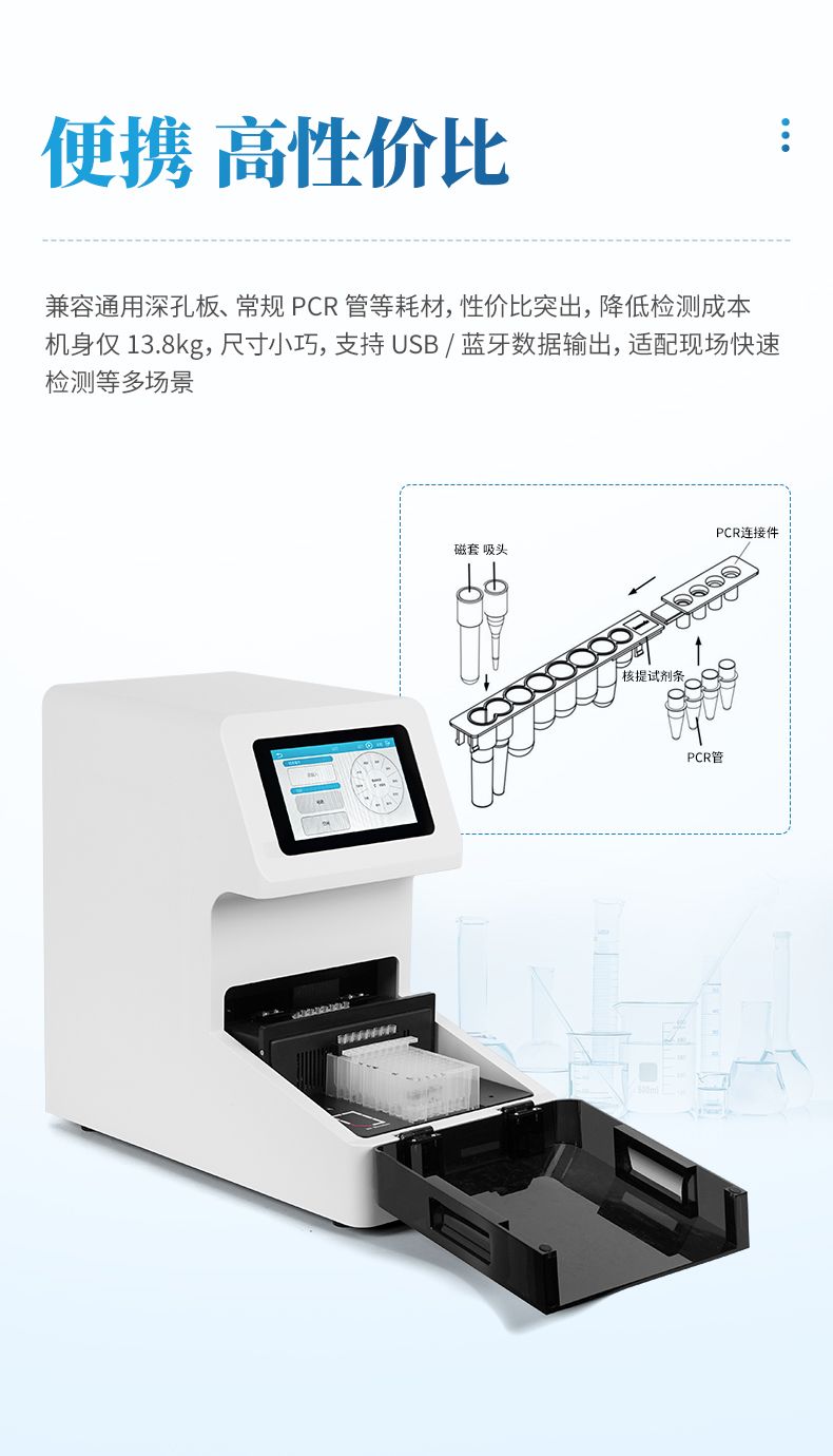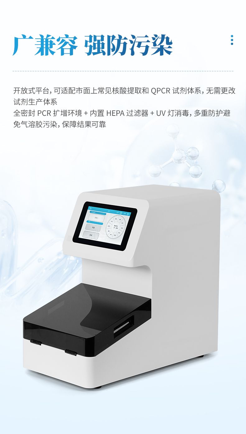 實(shí)現(xiàn)“樣本進(jìn)-結(jié)果出”的全自動(dòng)流程。PCR擴(kuò)增在密閉的環(huán)境中進(jìn)行核酸的擴(kuò)增和檢測(cè),可避免氣溶膠污染。儀器為開(kāi)放系統(tǒng),可適配市面上常見(jiàn)的試劑體系,應(yīng)用場(chǎng)景廣泛,如動(dòng)植物疫病檢測(cè),現(xiàn)場(chǎng)快速檢測(cè)等。