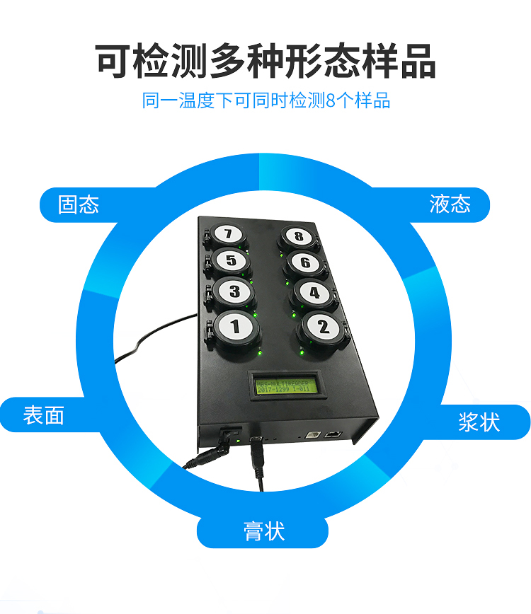4) 檢測(cè)樣本只需1ml/1g;同一溫度下可同時(shí)檢測(cè)8個(gè)樣品;
