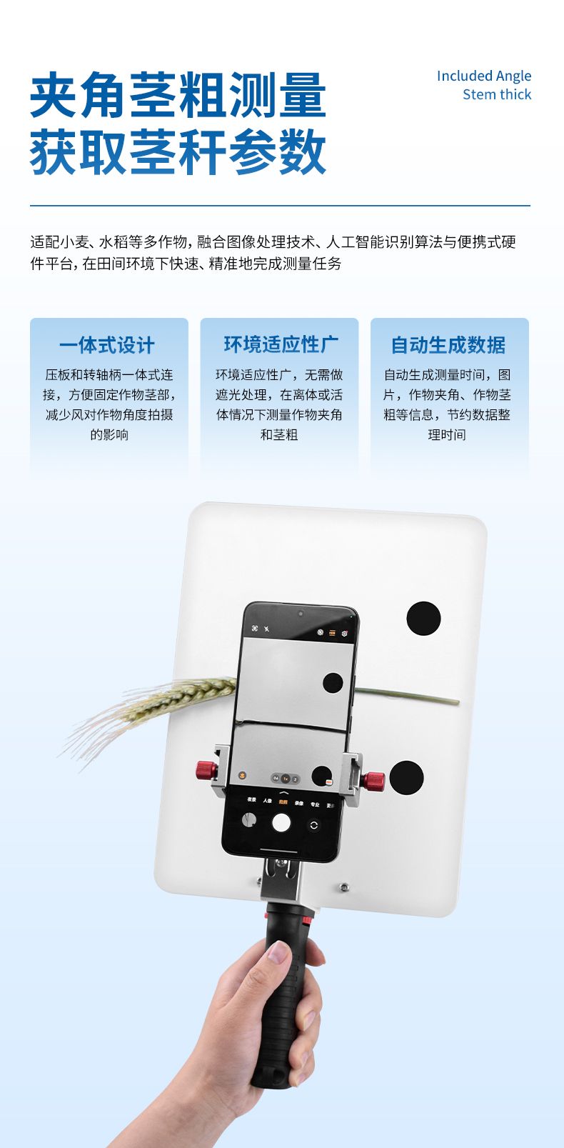 本設(shè)備適用于田間調(diào)查、育種選育、產(chǎn)量預(yù)估等多種應(yīng)用場景,為小麥的品種篩選、小麥產(chǎn)量預(yù)測、產(chǎn)量基因定位和功能解析發(fā)揮著至關(guān)重要的作用??娠@著減少人工計數(shù)帶來的誤差與勞動強度。用戶只需在田間選定樣方區(qū)域,拍攝圖像后即可自動獲得畝穗數(shù)估算結(jié)果,是農(nóng)業(yè)數(shù)字化與智能化發(fā)展的有力工具。