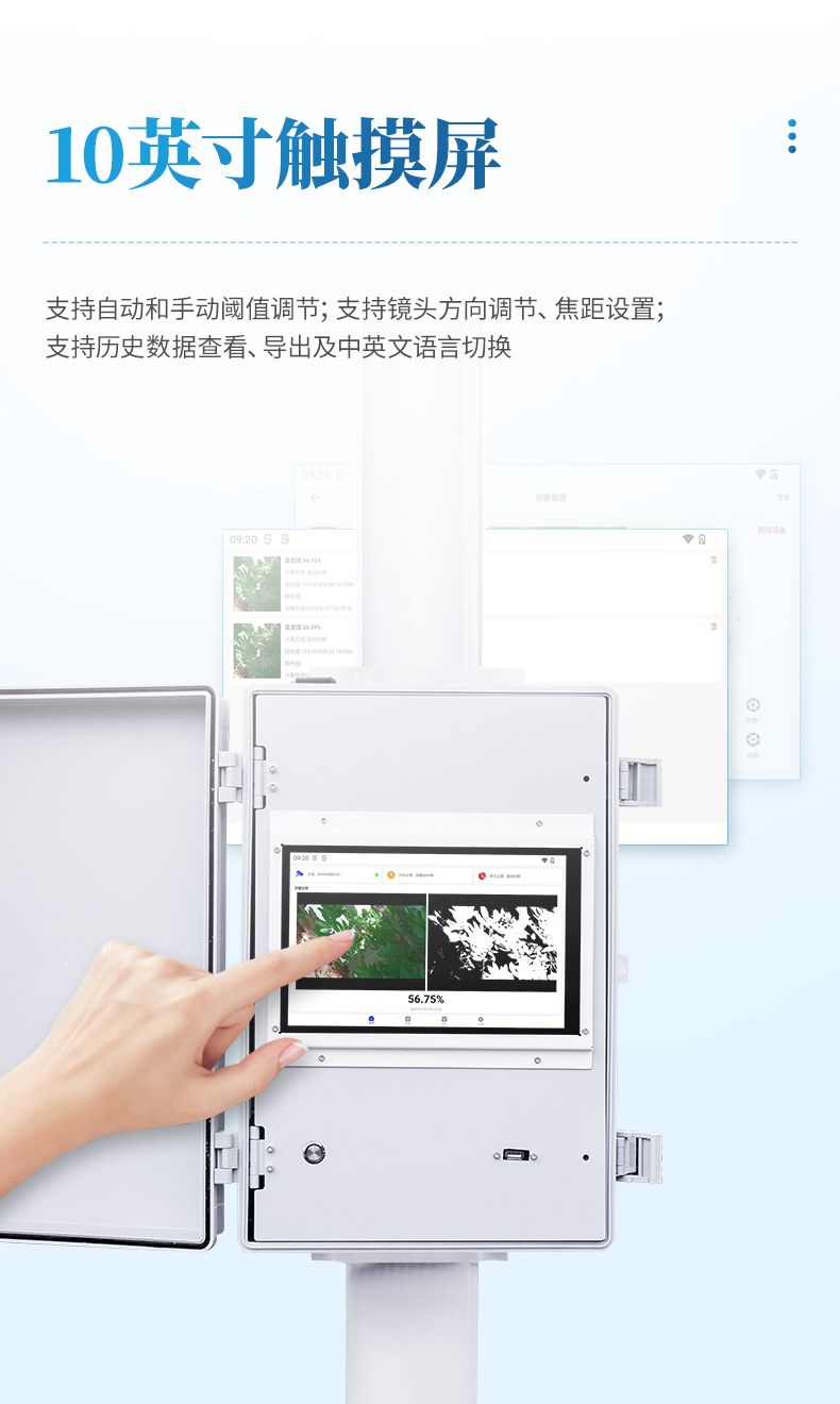 4. 分析主機(jī):10寸彩色觸摸顯示屏,支持自動和手動閾值調(diào)節(jié);自動區(qū)分植被與非植被區(qū)域;支持鏡頭方向調(diào)節(jié)、焦距設(shè)置;支持歷史數(shù)據(jù)查看、導(dǎo)出及中英文語言切換。