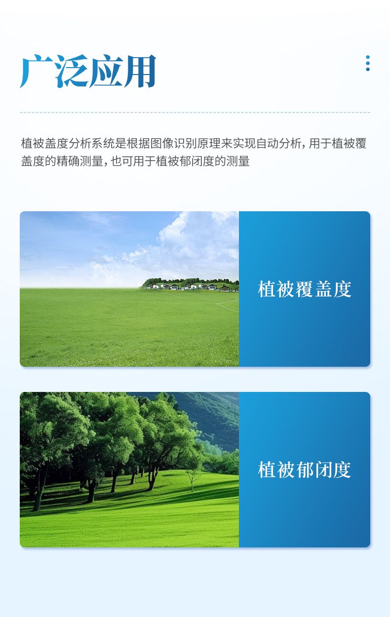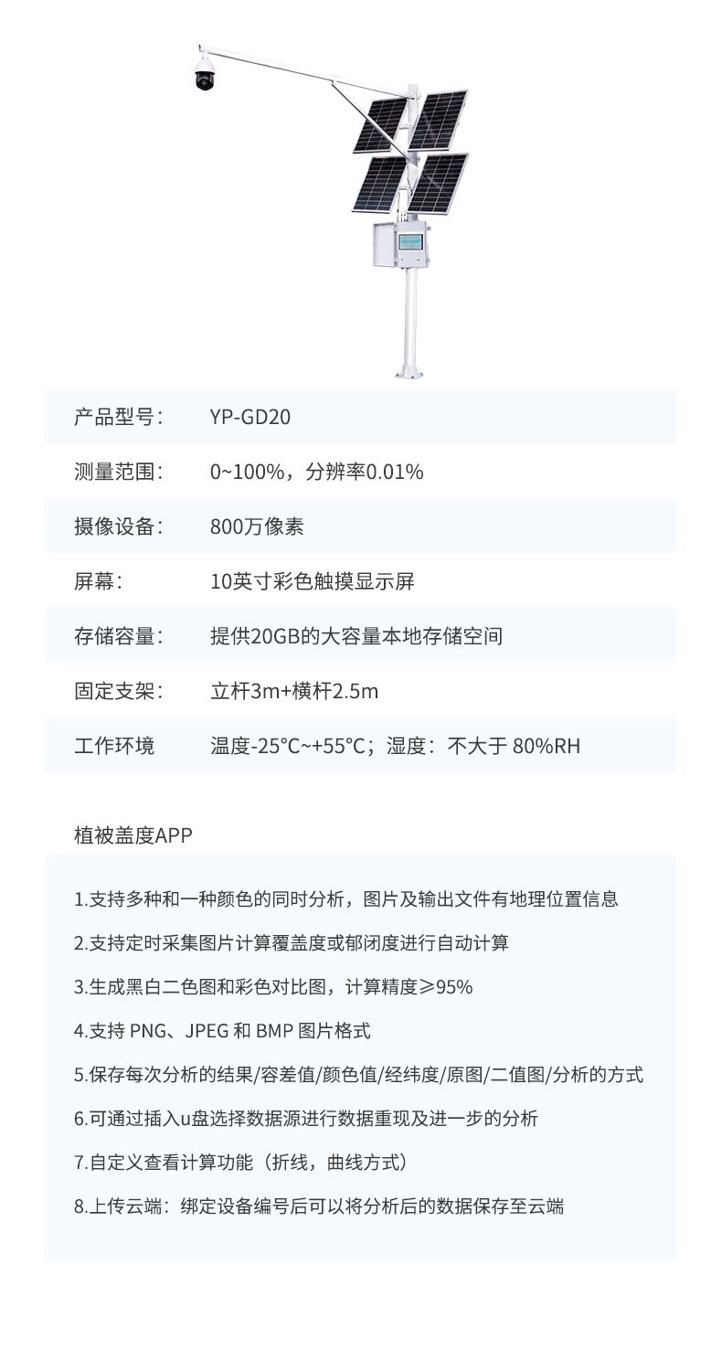 植被蓋度分析系統(tǒng)根據(jù)圖像識別原理來實(shí)現(xiàn)自動分析,用于植被覆蓋度和郁閉度的精確測量。儀器具有良好的防水性能,并帶有太陽能供電系統(tǒng),可在戶外環(huán)境下長期自動定時采集分析,獲取植被長期生長變化情況。