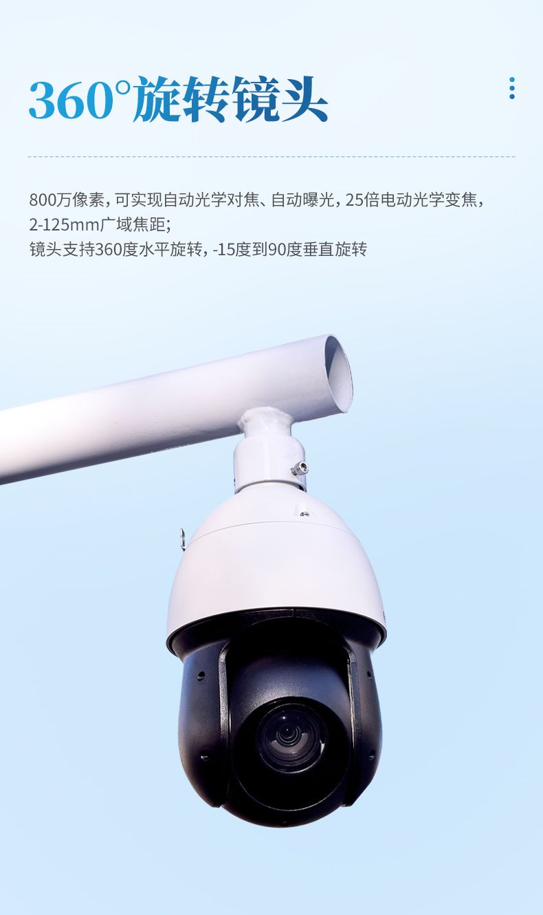 3. 攝像設(shè)備:800萬像素,可實(shí)現(xiàn)自動光學(xué)對焦、自動曝光,25倍電動光學(xué)變焦, 2mm-125mm廣域焦距;鏡頭支持360度水平旋轉(zhuǎn),-15度到90度垂直旋轉(zhuǎn)