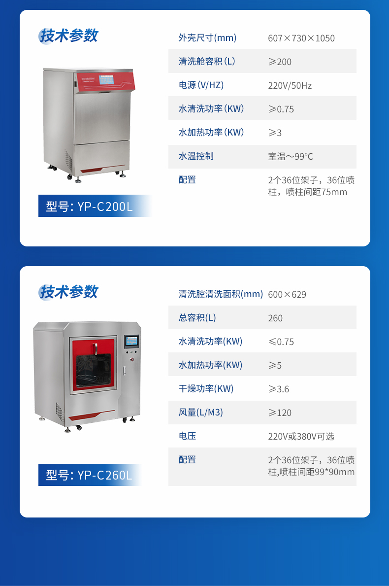 4.1 清洗艙容積≥200L; 外形尺寸:607×730×1050;電源(V/HZ):220V/50Hz;