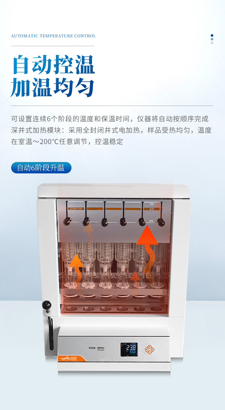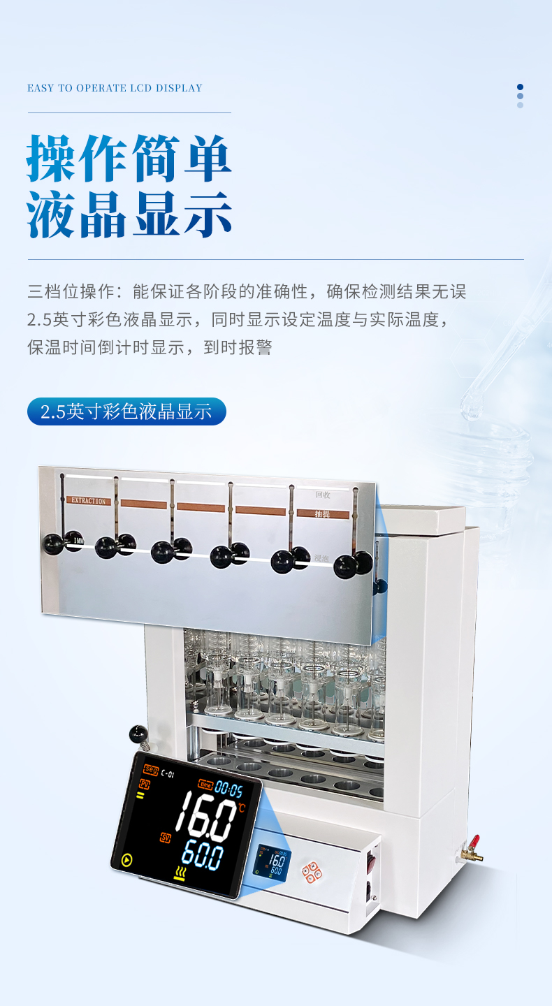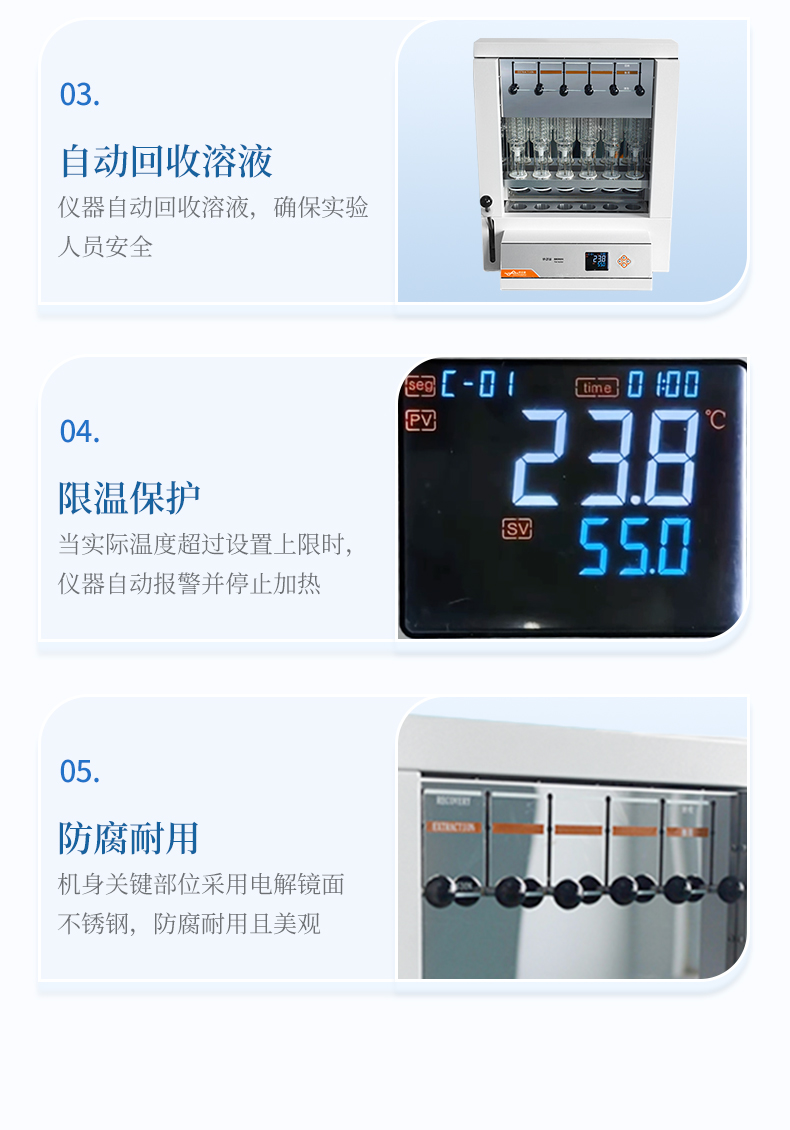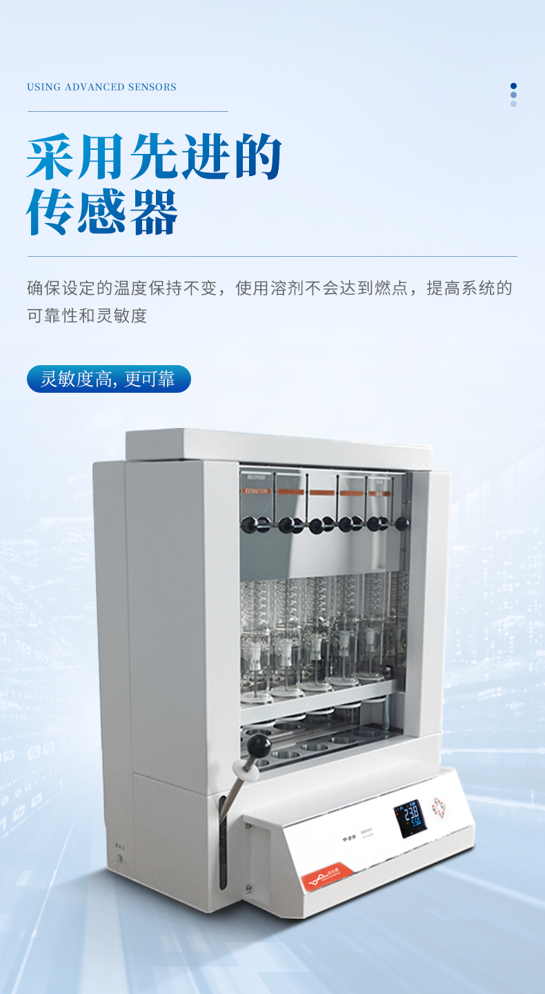 自動(dòng)脂肪測定儀(索氏提取儀)是根據(jù)索氏抽提原理,集熱浸泡、抽提、 淋洗、溶劑回收、烘干于一體,對(duì)脂肪等有機(jī)物進(jìn)行萃取分離的儀器。儀器采用了自 動(dòng)控溫、全封閉井式電加熱形式,使儀器加溫更為均勻,安全可靠,并具有良好的密 封設(shè)施,從而達(dá)到快速準(zhǔn)確的目的;最大限度降低溶劑用量,自動(dòng)回收溶劑,節(jié)省分 析成本。具有設(shè)計(jì)合理、操作簡單、精確度高、性能穩(wěn)定、重現(xiàn)性 好、省力、省時(shí)等優(yōu)點(diǎn)。